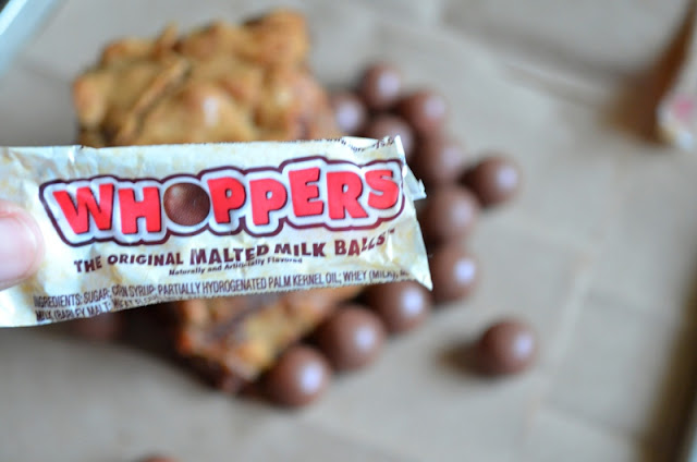 I have had these Whoppers lying around and have been just itching to use them but I could not find the right recipe. Most of the whopper recipes also call for malt powder which I did not have lying around. After some searching-- I found this recipe for Whopper Blondies. I am a huge fan of blondies and brownies. I always make them on the gooey side- and I just cannot resist the ooey gooey goodness....mmmmmm....